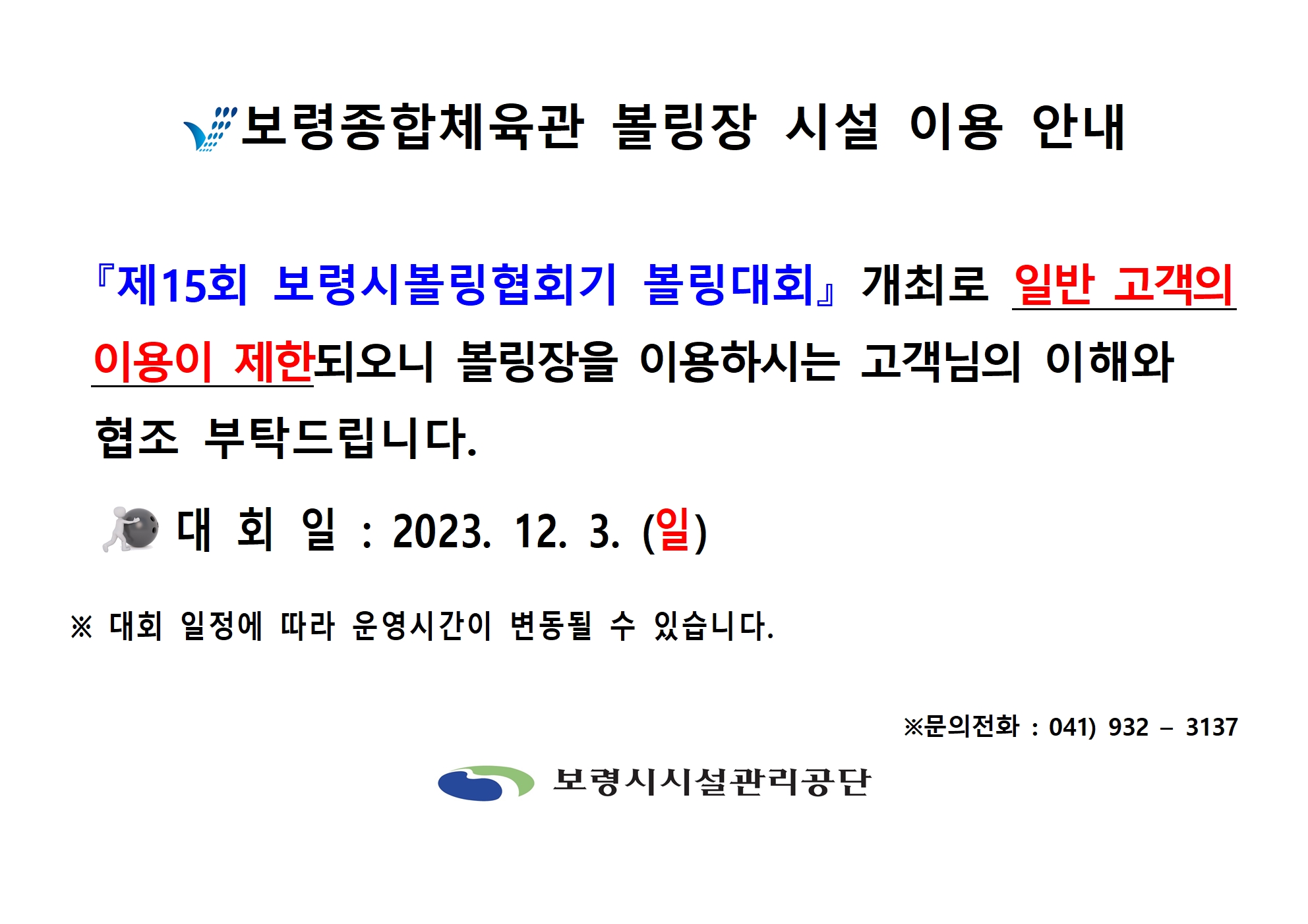 볼링장 시설이용안내(제15회 보령시볼링협회장기 볼링대회)