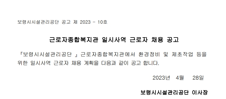 2023년 근로자종합복지관 일시사역 근로자 채용 공고