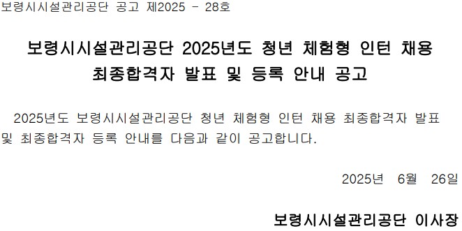 보령시시설관리공단 2025년도 청년 체험형 인턴 채용 최종합격자 발표 및 등록 안내 공고